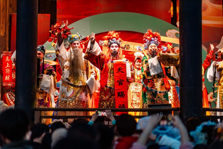 在年货节基础上,南岳里同步推出“非遗新春·国潮百戏”系列演艺活动。正月期间,高跷巡游、天官赐福、烟花木偶戏、鱼灯巡游、非遗踏春等节目轮番登场,打铁花、瀑布烟花等夜间演出点亮湖面夜空,为年货节增添浓厚节庆氛围。
